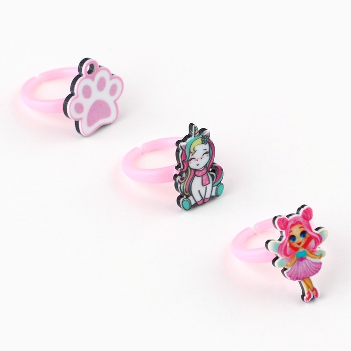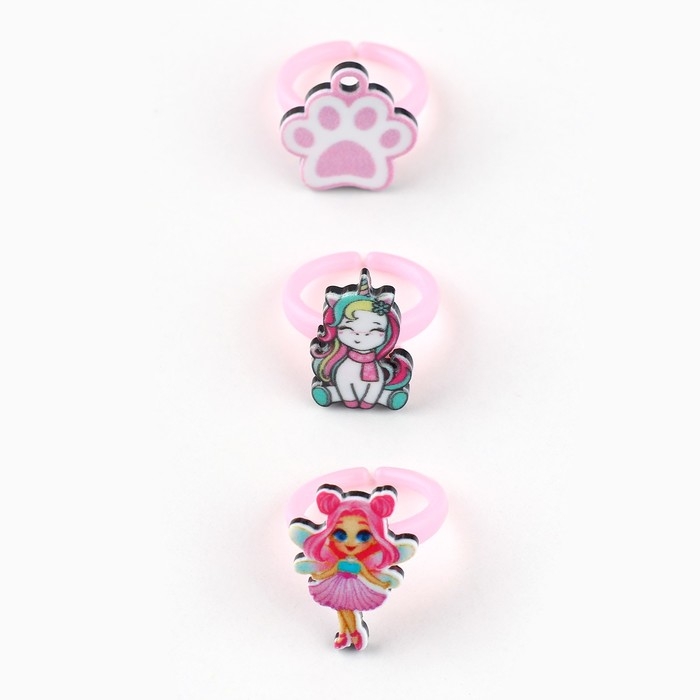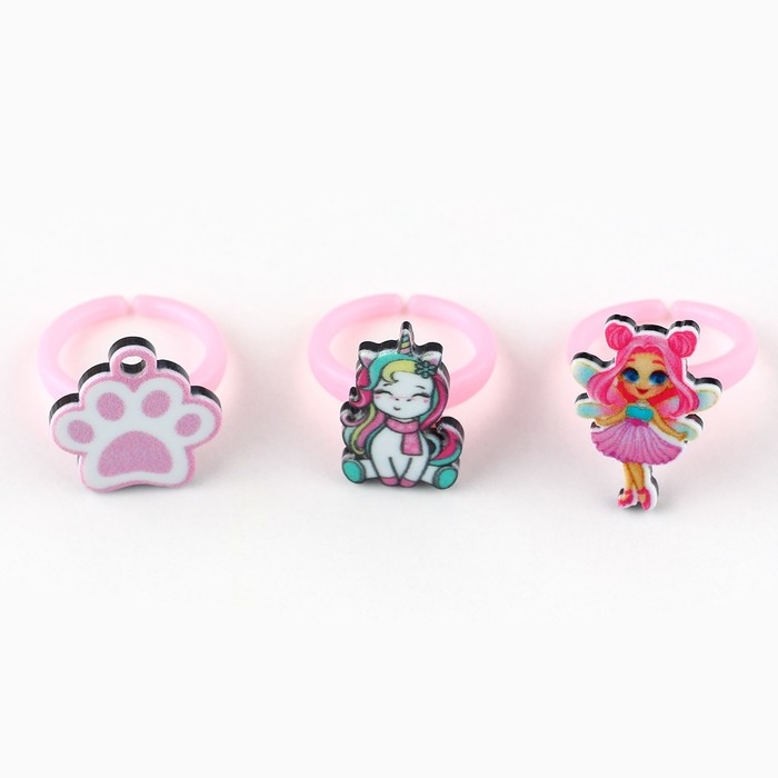 В нашем наборе детских колец есть множество различных аксессуаров, которые подойдут маленькими девочками. Кольца (бижутерия) сделаны из высококачественного гипоаллергенного бижутерного сплава и пластика, который не нанесет вреда коже ребенка. Кольца для девочек имеют форму популярных фигурок для этого возраста, от единорогов и зайчиков до сердец и радуг. Детские украшения прекрасно подойдут в качестве подарка на любой праздник и могут быть ношены на каждый день или на особые мероприятия, такие как выпускной из детского сада или день рождения.