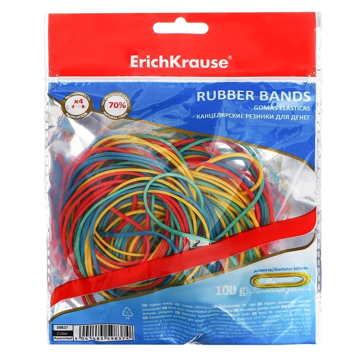 Банковская резинка, 100 г, ErichKrause, диаметр 60 мм, длина 100 мм, ZIP-пакет с европодвесом, микс