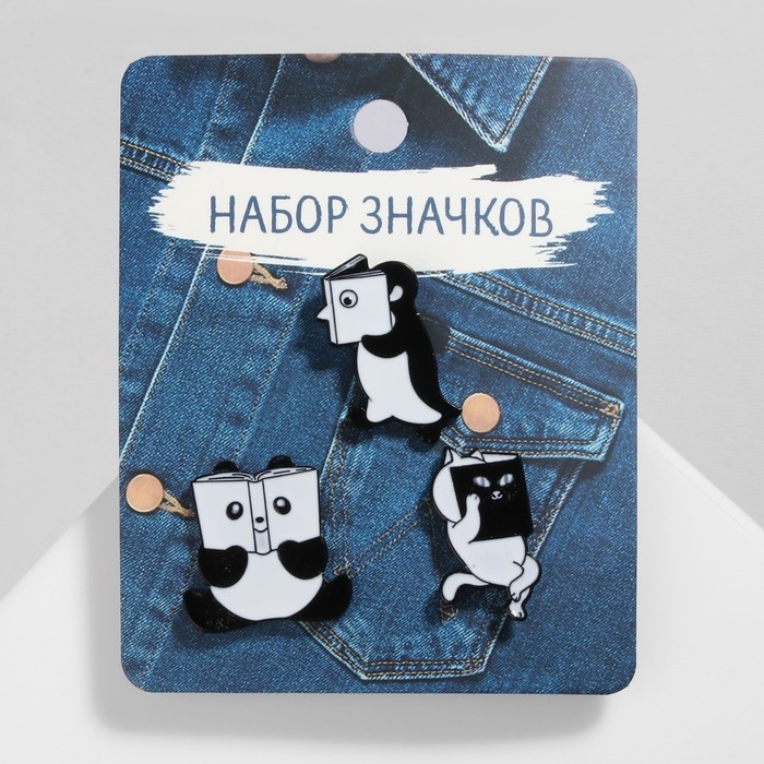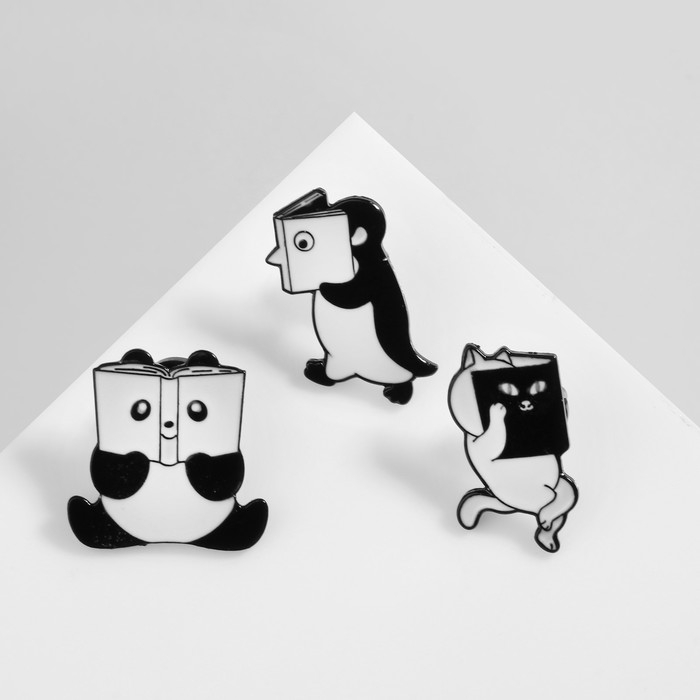 Набор значков (3 шт.) «Комиксы» с животными, цвет чёрно-белый в чёрном металле