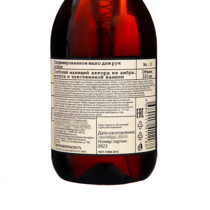 Parfumed Soap Studio VEGAN Love ваниль, амбра, мускус, 300 мл - это утонченное парфюмированное мыло, разработанное для элегантного ухода за кожей. Оно не только эффективно очищает, но и оставляет на коже легкий, чувственный аромат, создавая неповторимый шлейф.
