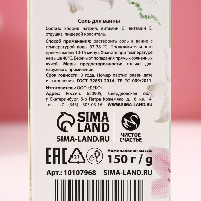Соль для ванны «Самой нежной», 150 г, аромат мяты, ЧИСТОЕ СЧАСТЬЕ