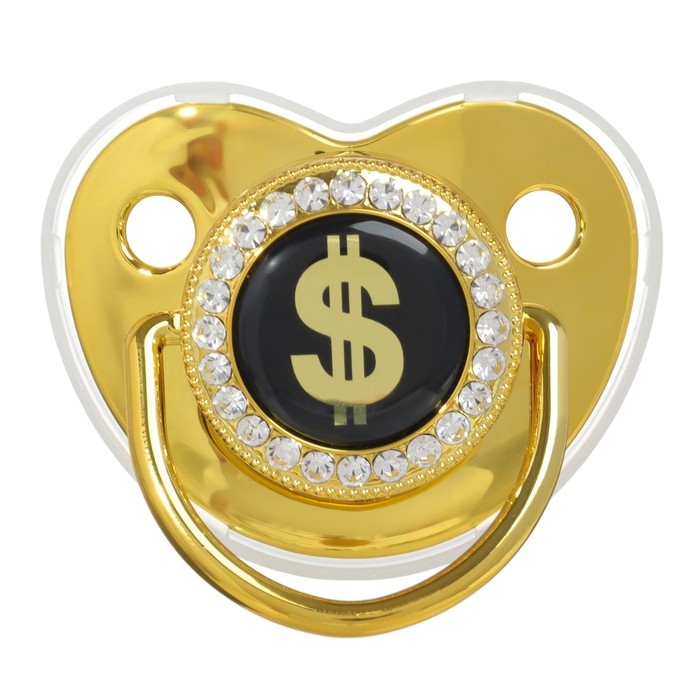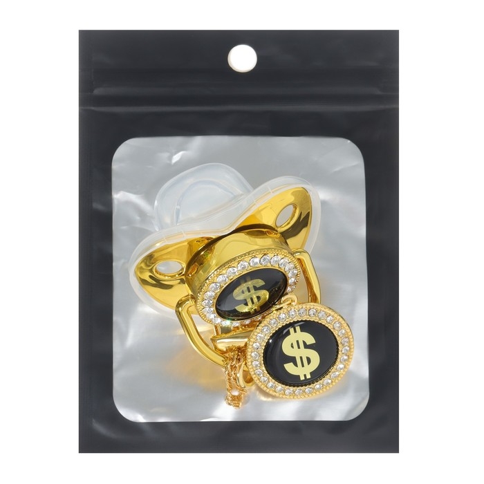 Соска - пустышка силиконовая ортодонтическая «Доллар», от 6 мес., с колпачком + держатель - цепочка, цвет золотой/черный, стразы