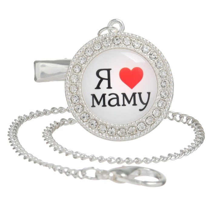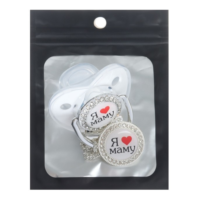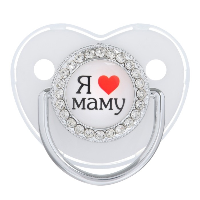 Соска - пустышка силиконовая ортодонтическая «Я люблю маму», от 6 мес., с колпачком + держатель - цепочка, цвет серебренный, стразы