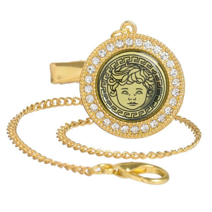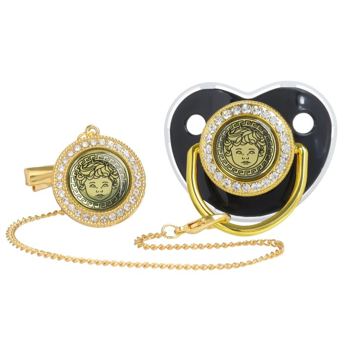 Соска - пустышка силиконовая ортодонтическая «Наш ангел», от 6 мес., с колпачком + держатель - цепочка, цвет черный/золото, стразы