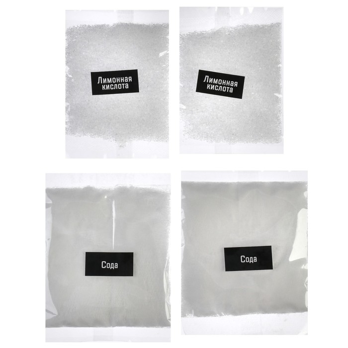 - Смешайте в стакане пакетик пищевой соды, крахмал и лимонную кислоту. Тщательно всё перемешайте, чтобы не было комочков.