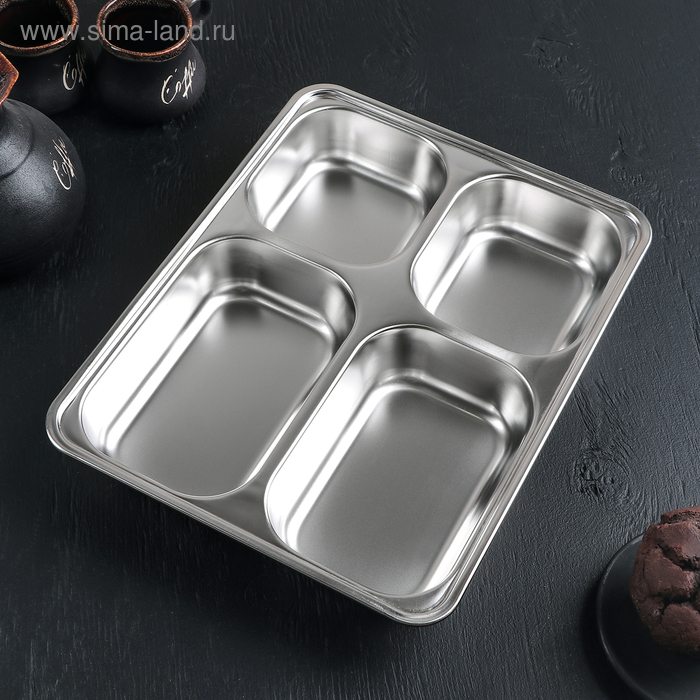 Поднос глубокий из нержавеющей стали, 4 секции, 28×22×4,5 см, 420 мл/280 мл
