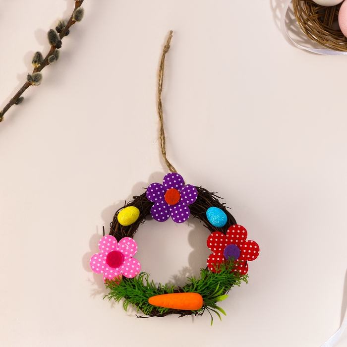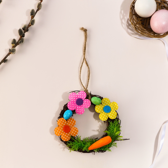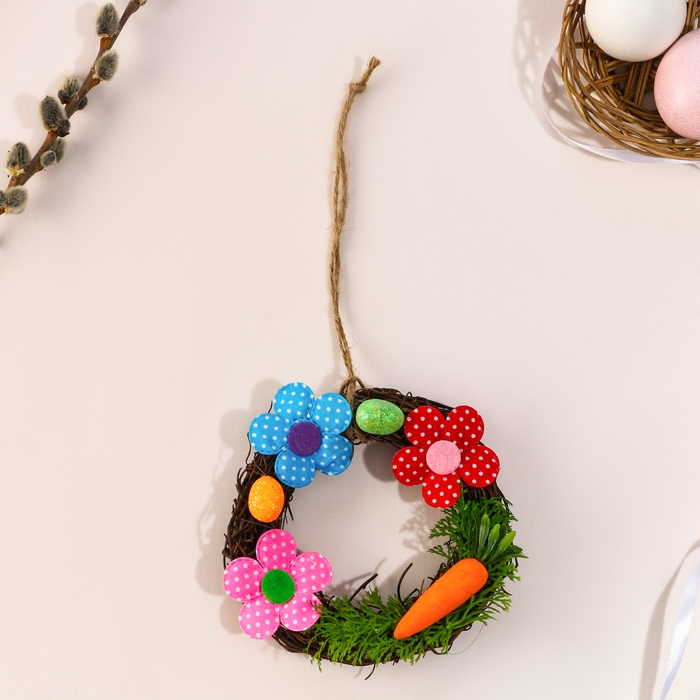 Венок подвеска на Пасху с цветочками — это замечательный декор, дарящий уют и праздничное настроение вашему дому. Он идеален для различных интерьерных решений. Яркие весенние цвета и украшения в виде цветочков помогают создать атмосферу радости и праздника.