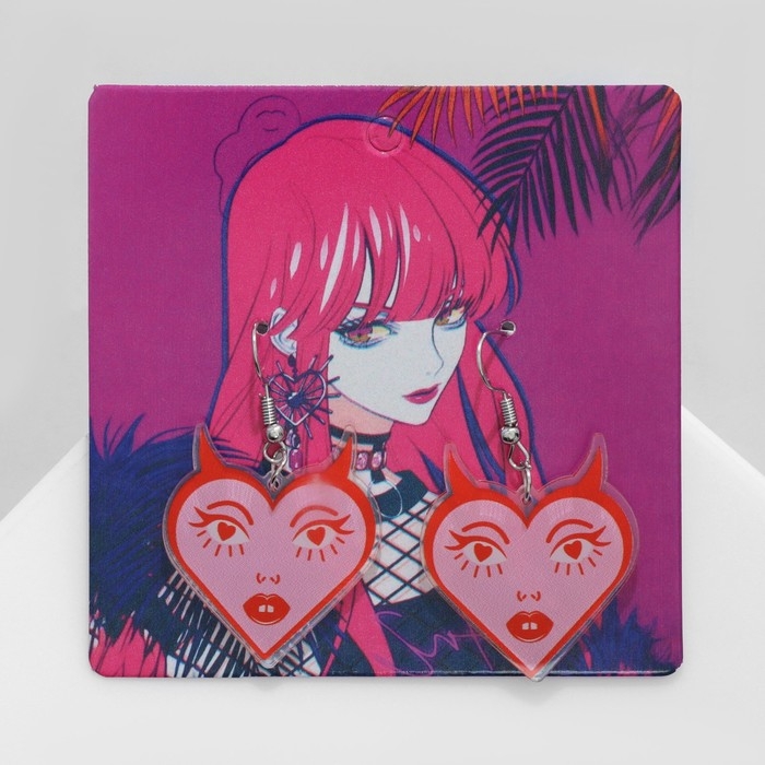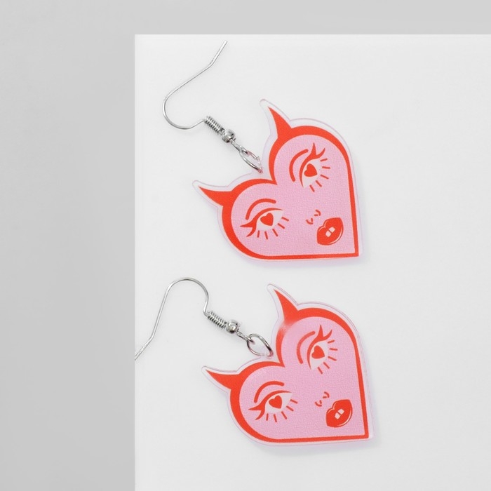 Серьги акрил «Сердце» с лицом, цвет розово-красный