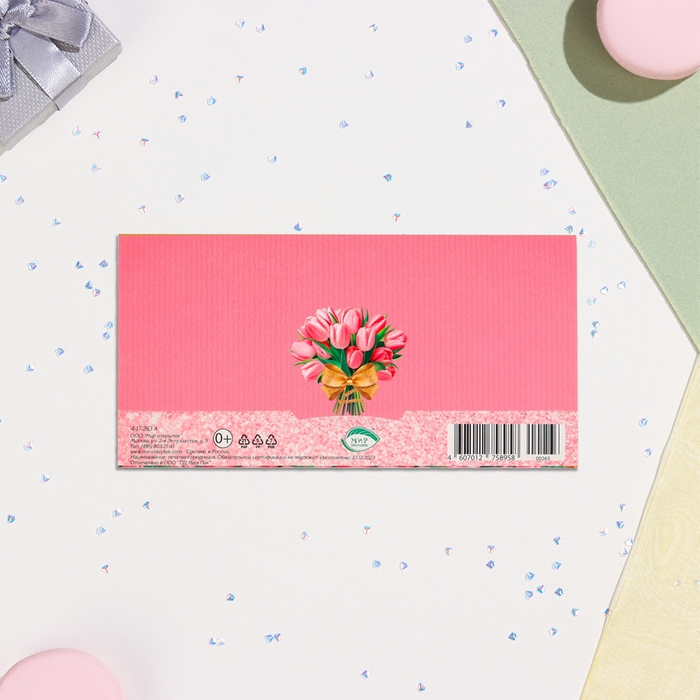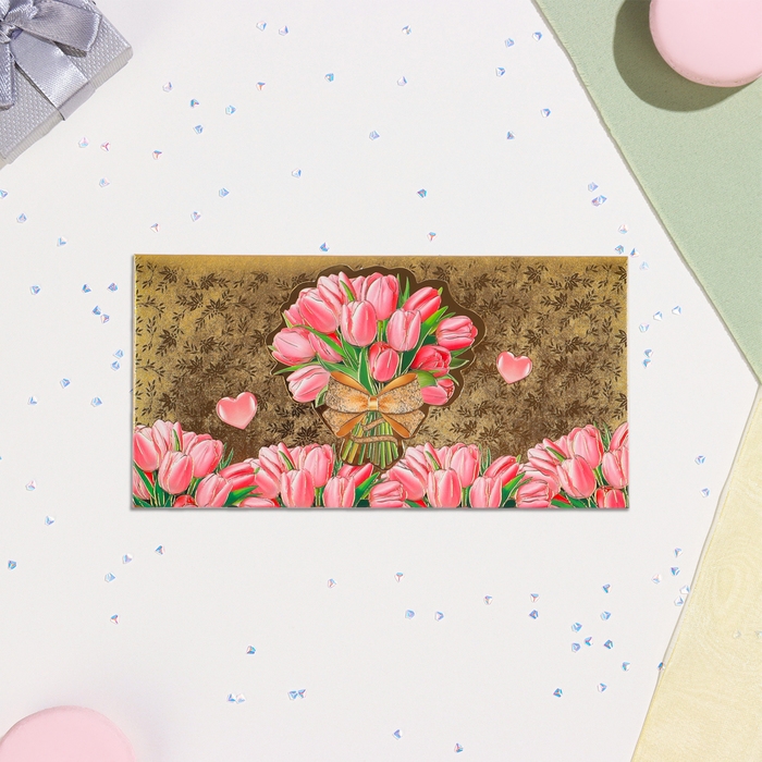 Конвер для денег "Нежности, любви, вдохновения!" тиснение, букет тюльпанов, 16,5х8,5 см