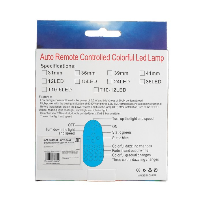 Автолампа светодиодная C5W, 12 В, 6 SMD, 36 мм, мульти свечение, пульт, набор 2 шт