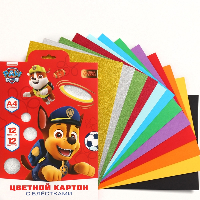 Картон цветной с блёстками, А4, 12 листов, 12 цветов, немелованный, двусторонний, в папке, 250 г/м², Щенячий патруль