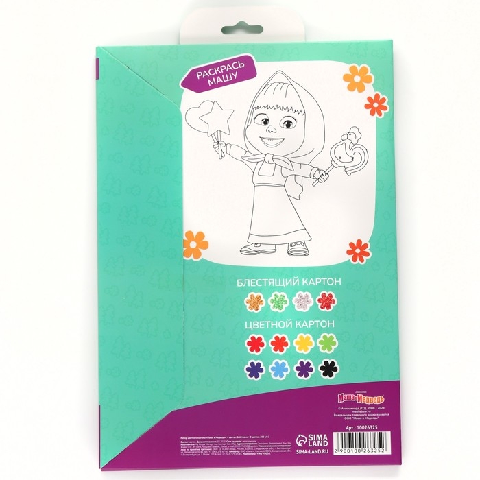 Картон цветной с блёстками, А4, 12 листов, 12 цветов, немелованный, двусторонний, в папке, 250 г/м², Маша и Медведь