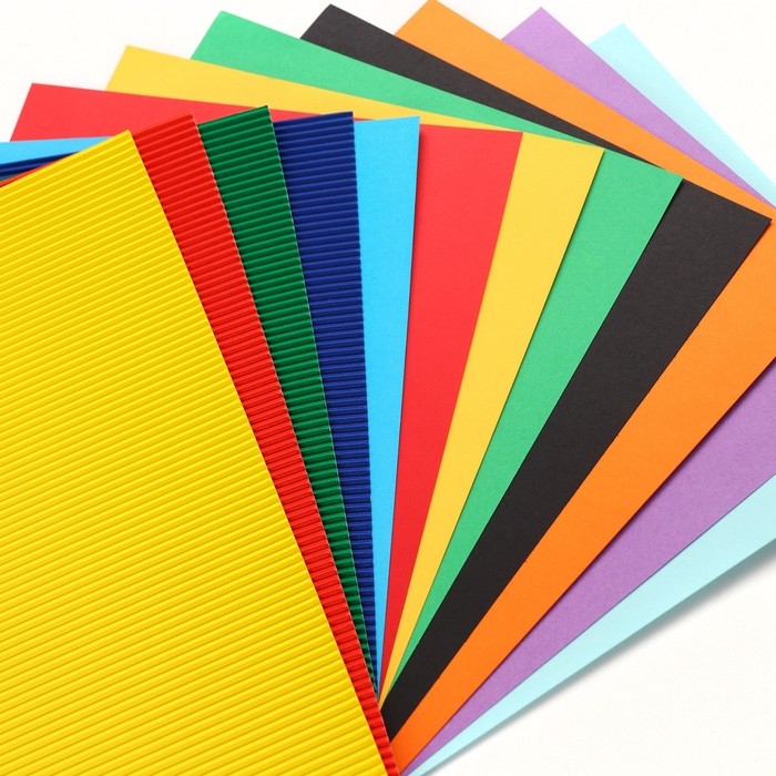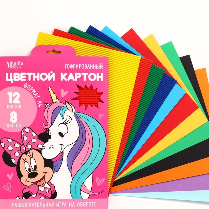 Картон цветной гофрированный, А4, 12 листов, 12 цветов, немелованный, двусторонний, в папке, 230 г/м², Минни Маус и Единорог