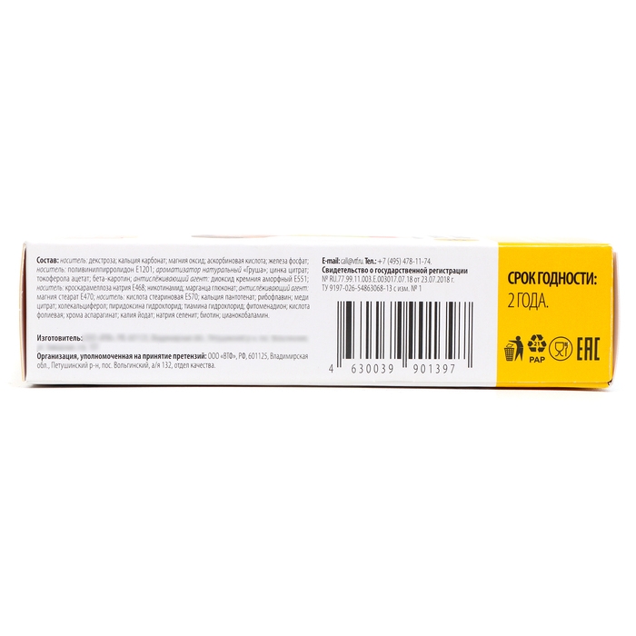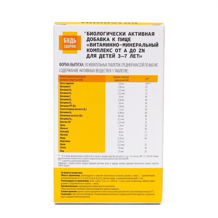 Витаминно-минеральный комплекс "Будь Здоров!" от А до Цинка для детей вкус груши - это препарат, который содержит комплекс витаминов и минералов, необходимых для поддержания здоровья и развития детей. Он упакован в удобные таблетки, всего в упаковке 30 штук.