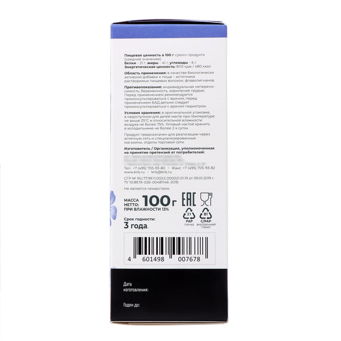 Грин лён "Будь Здоров!" - это натуральный продукт, который содержит семена льна. Он упакован в удобную упаковку весом 100 г.