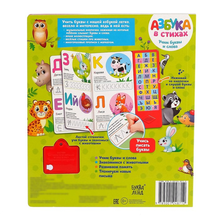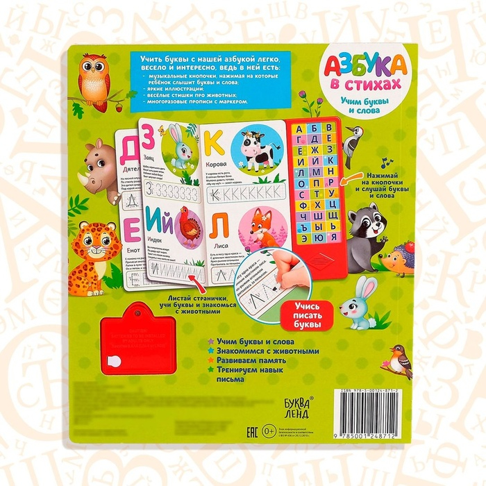 С книгой малыш выучит буквы и слова, познакомится с животными, разовьёт память, а также потренирует навык письма.