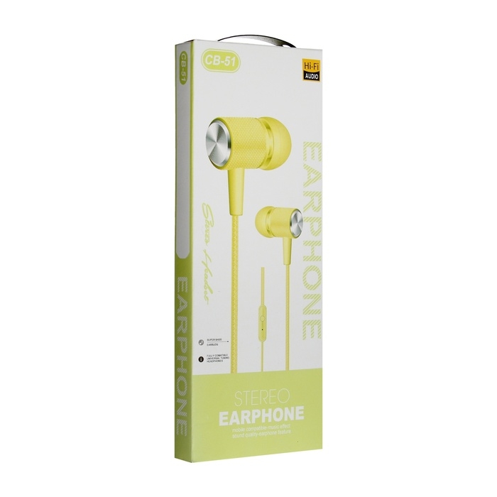 Наушники CB-51, проводные, вакуумные, микрофон, 1 м, Jack 3.5 мм, жёлтые