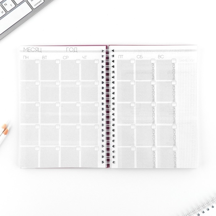 Этот еженедельник поможет тебе в организации планов. Он состоит из 12 разворотов на каждый месяц и 5 разворотов на неделю.