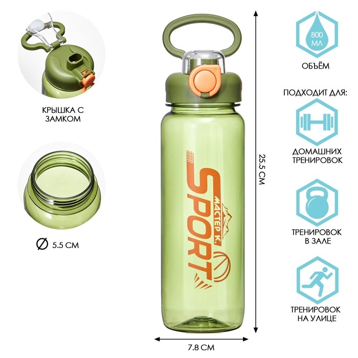 Бутылка для воды, 800 мл, SPORT, 800 мл, с поильником, зеленая