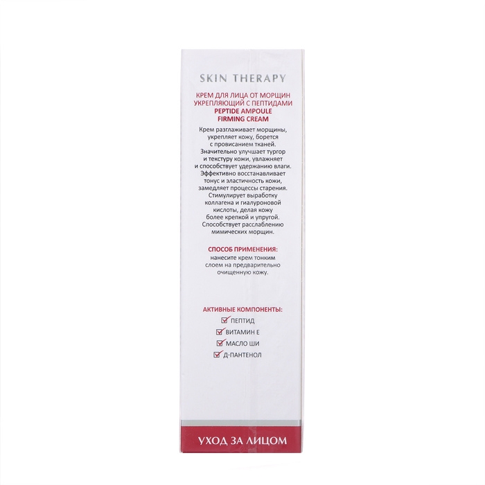 - Пептиды в составе крема стимулируют выработку коллагена и эластина, укрепляя кожу и улучшая её упругость, что способствует уменьшению видимости морщин.