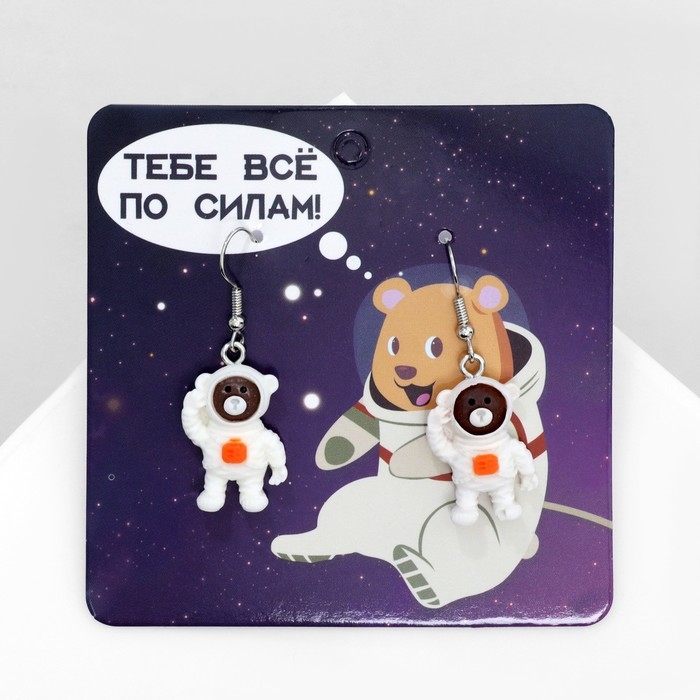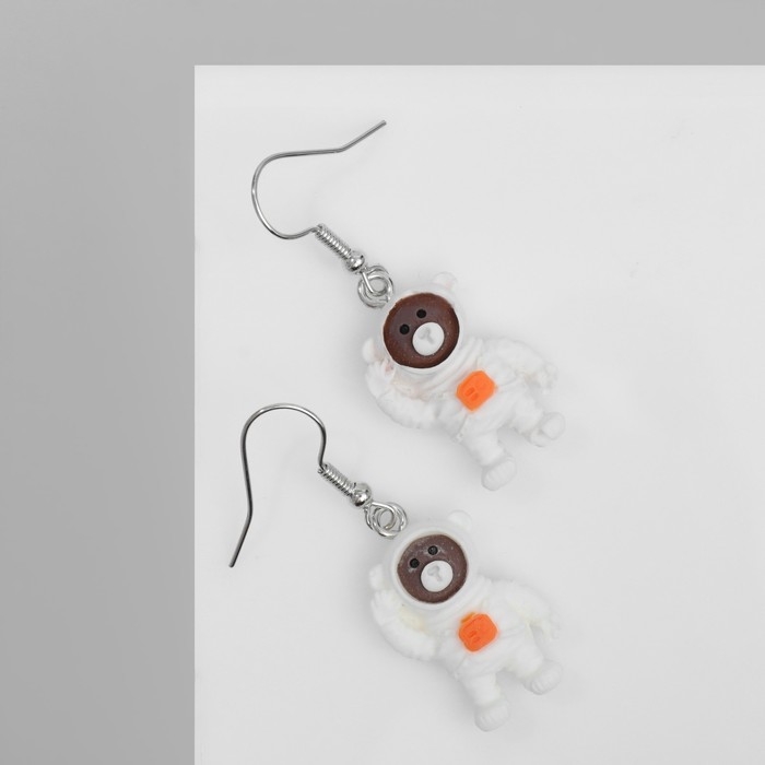 Серьги ассорти «Радость» космонавты медведи, цвет коричнево-белый в серебре