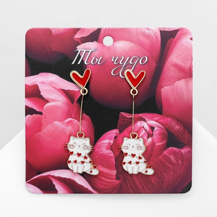 Серьги эмаль «Котики» любовь, сердечки, цвет бело-красный в золоте