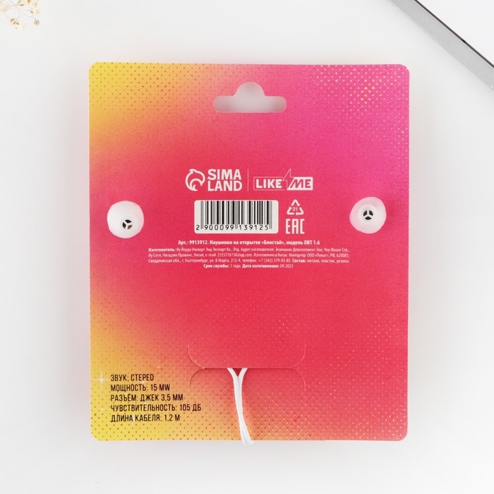 Наушники на открытке "Блистай", мод. OBT 1.6, 120 см