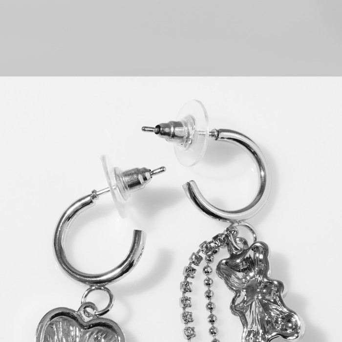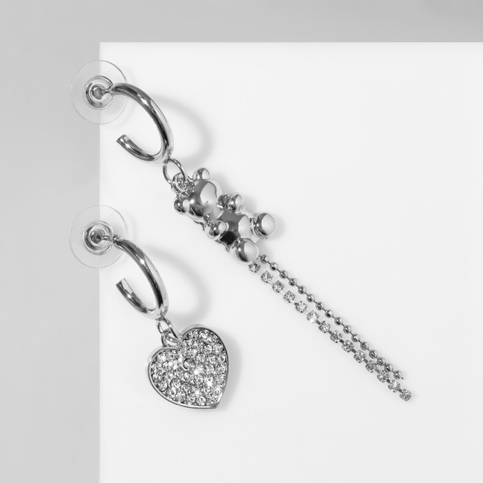 Серьги висячие со стразами «Мишка» с сердцем, цвет белый в серебре