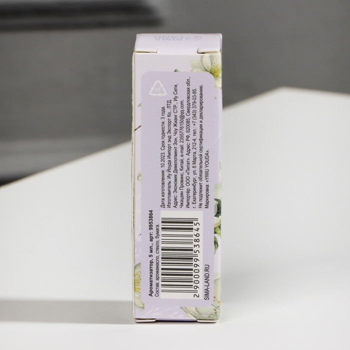 Бутылочка объемом 10 мл заключена в красивую картонную коробочку с изображением жасмина.