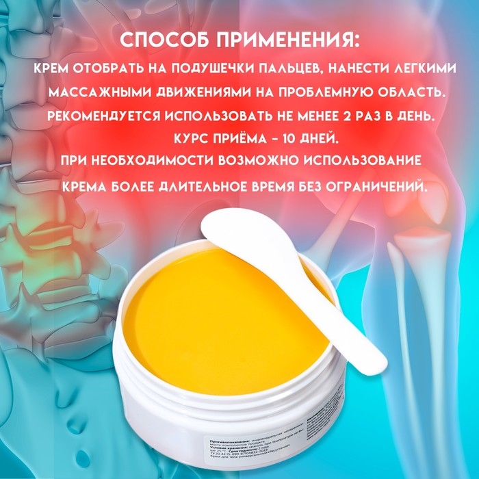 Способ применения: крем отобрать на подушечки пальцев, нанести легкими массажными движениями на проблемную область. Рекомендуется использовать не менее 2 раз в день. Курс приёма – 10 дней. При необходимости возможно использование крема более длительное время без ограничений.