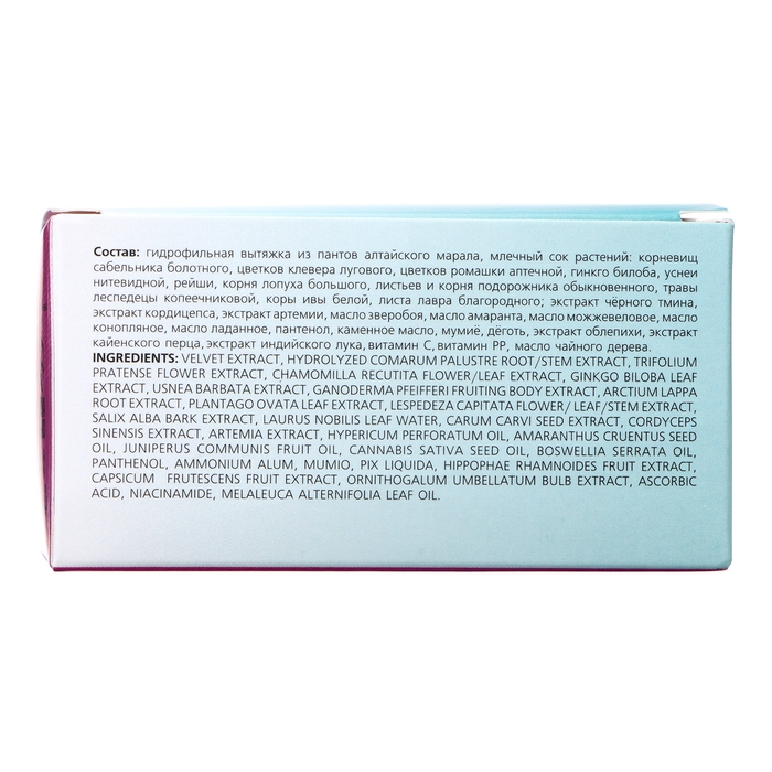 Состав: гидрофильная вытяжка из пантов алтайского марала, млечный сок растений: корневищ сабельника болотного, цветков клевера лугового, цветков ромашки аптечной, гинкго билоба, уснеи нитевидной, рейши, корня лопуха большого, листьев и корня подорожника обыкновенного, травы леспедецы копеечниковой, коры ивы белой, листа лавра благородного; экстракт чёрного тмина, экстракт кордицепса, экстракт артемии, масло зверобоя, масло амаранта, масло можжевеловое, масло конопляное, масло ладанное, пантенол, каменное масло, мумиё, дёготь, экстракт облепихи, экстракт кенийского перца, экстракт индийского лука, витамин С, витамин РР, масло чайного дерева.