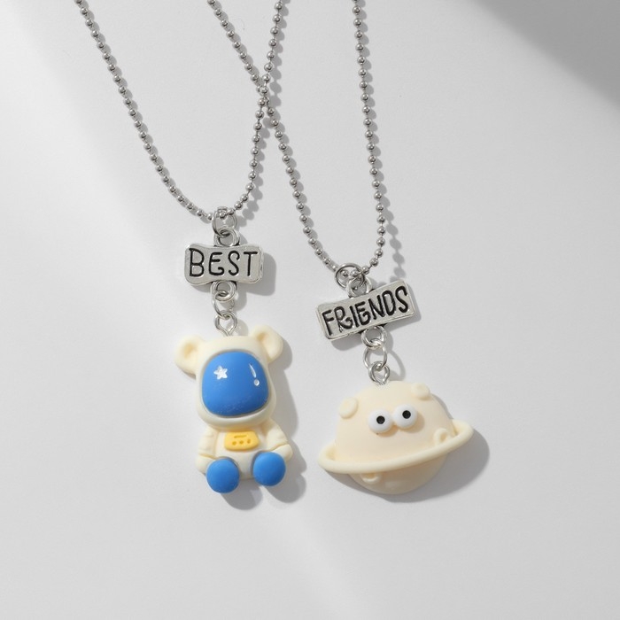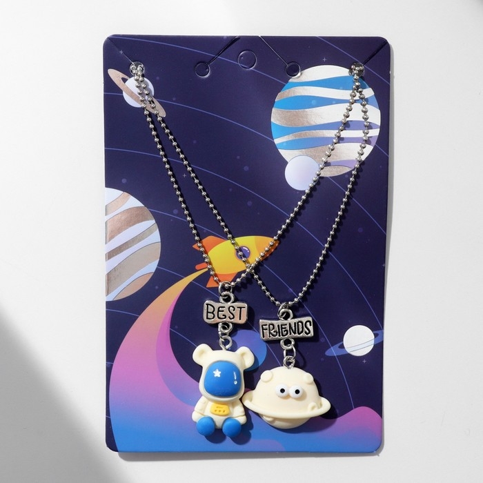 Кулоны «Неразлучники» космонавт и летающая тарелка, цвет сине-белый в серебре, 40 см