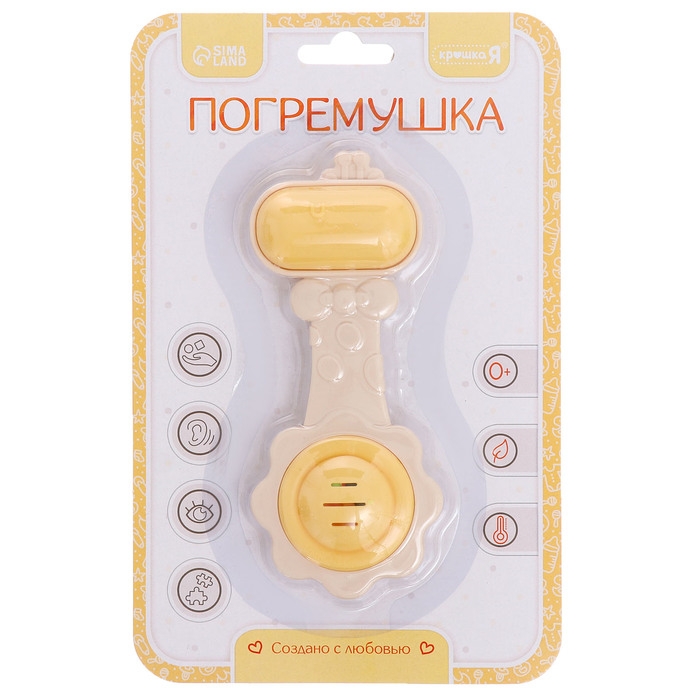 - При взаимодействии с игрушкой ребёнок услышит забавные звуки: внутри погремушки находится элемент с гремящими при движении шариками.
