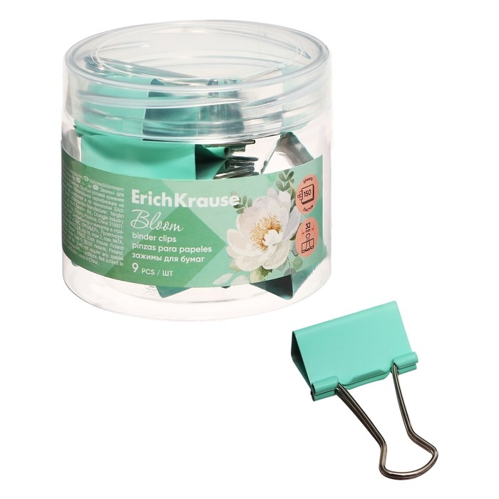 Набор зажимов для бумаг ErichKrause "Pastel Bloom", 32 мм, 9 штук, мятные, в пластиковой коробке