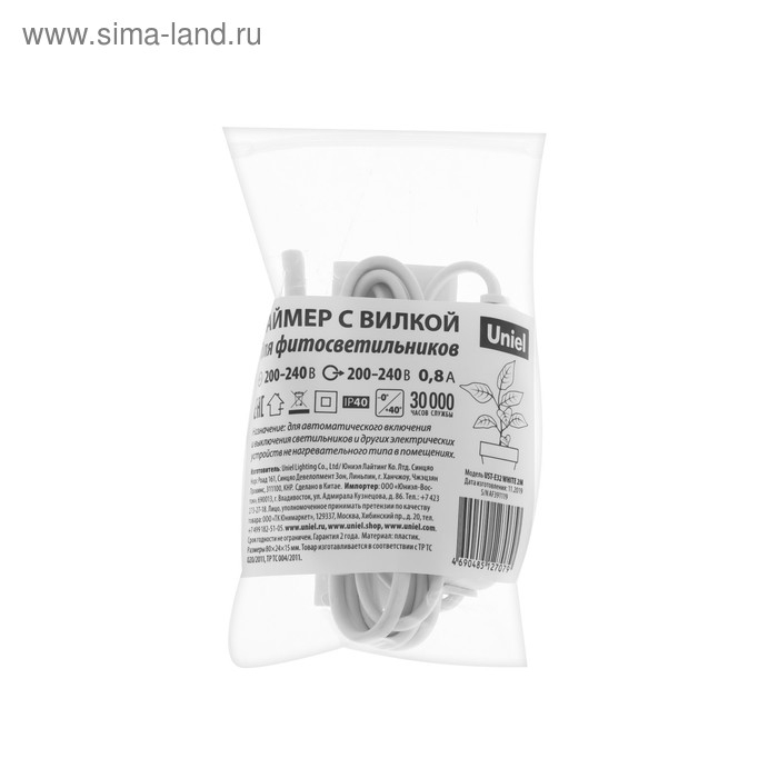 Таймер с вилкой Uniel, 220 В, 150 Вт, разъем L/N, для фитосветильника, провод 2 м