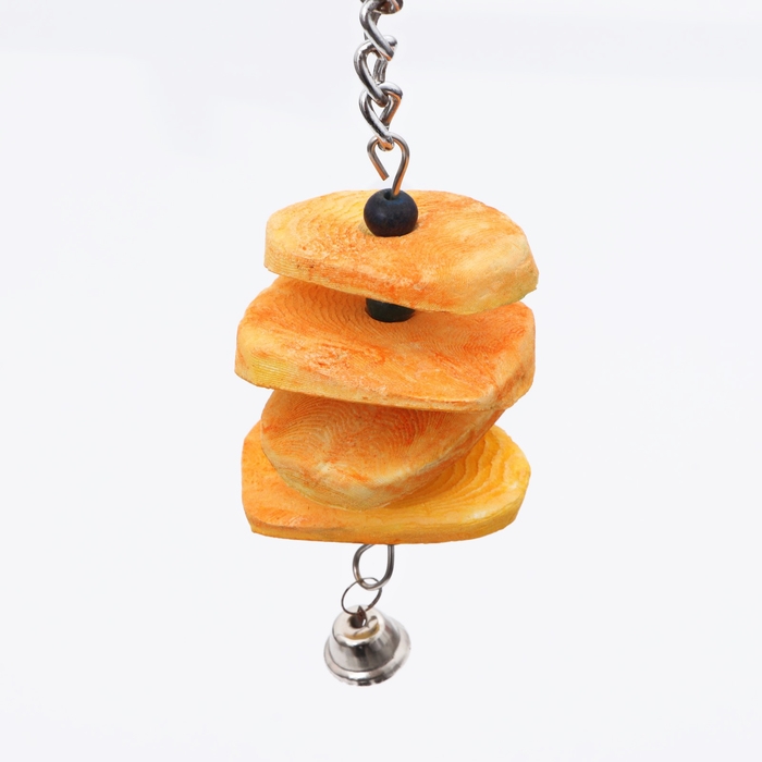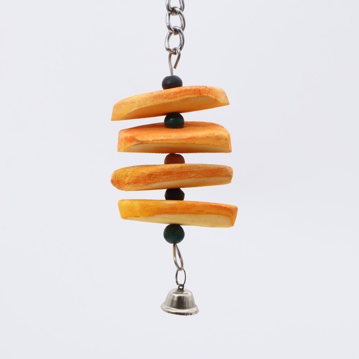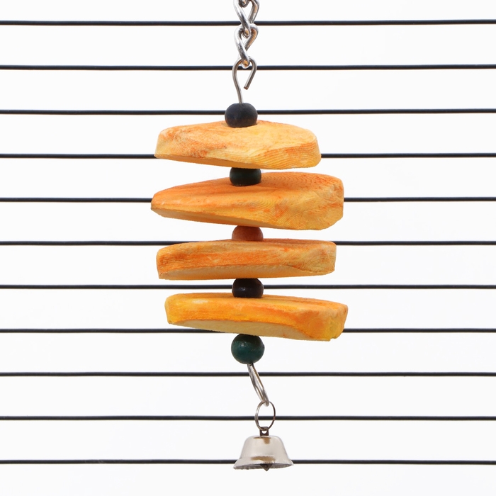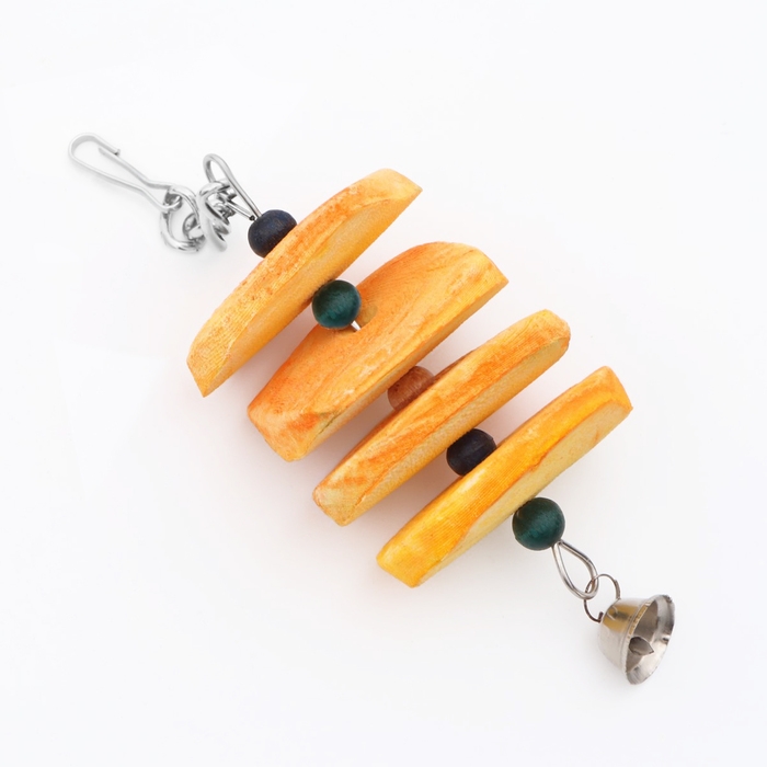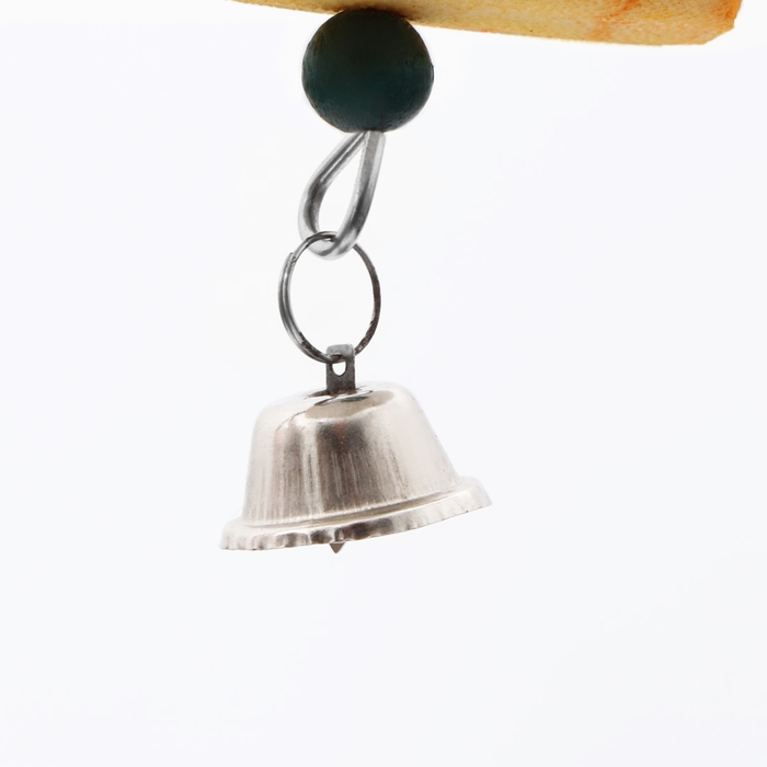 Игрушка сочетает в себе натуральные материалы и продуманный дизайн. Панцирь каракатицы обеспечивает птице необходимый кальций и способствует естественному стачиванию клюва, а яркие бусины развивают когнитивные способности и увлекают птицу в увлекательную игру. Звонкий колокольчик добавляет элемент сюрприза и стимулирует активность.