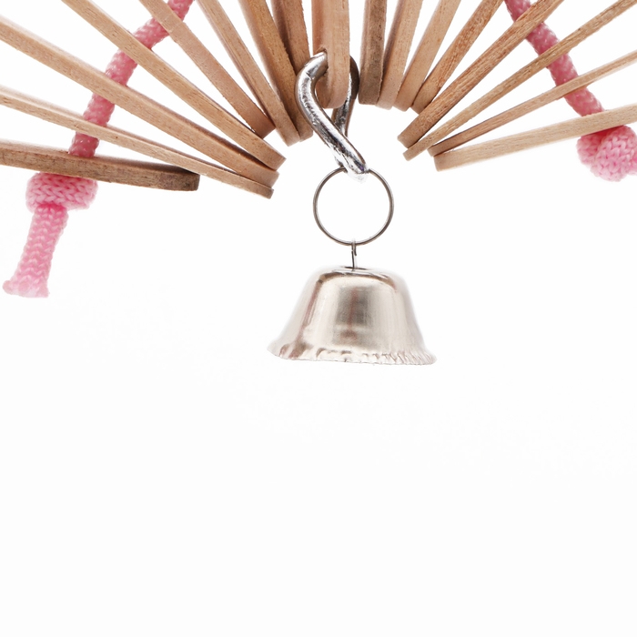 Игрушка состоит из веера, собранного из тонких деревянных пластин, и дополнена яркими бусинами. Вращаясь, веер привлекает внимание птицы, а звенящий колокольчик добавляет дополнительную стимуляцию. Такая конструкция идеально подходит для поддержания активности вашего питомца, что важно для его здоровья и хорошего настроения.