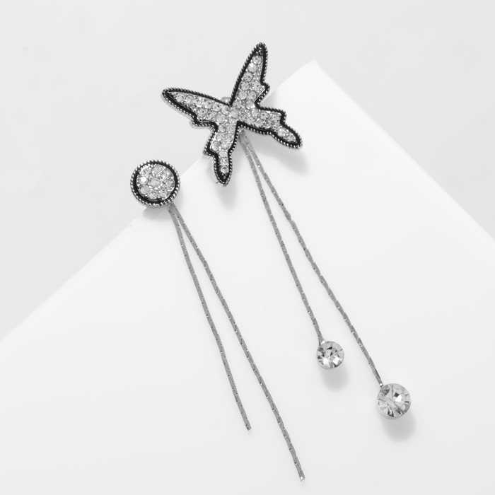 Серьги висячие со стразами «Бабочка» и круг, цвет чёрно-белый в серебре