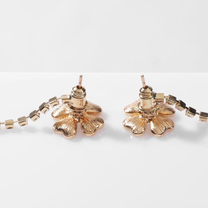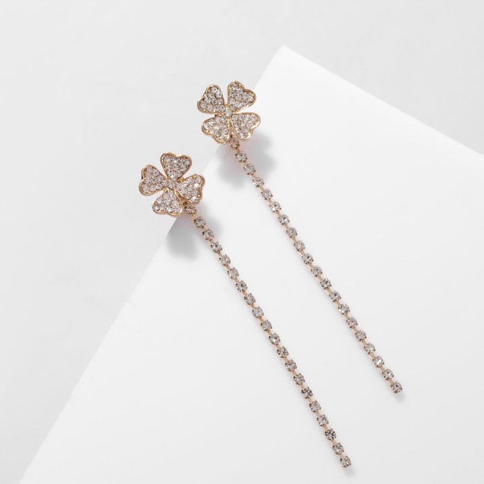 Серьги висячие со стразами «Четырёхлистник», цвет белый в золоте