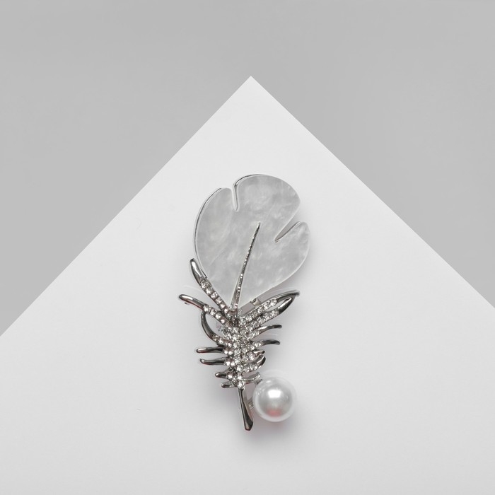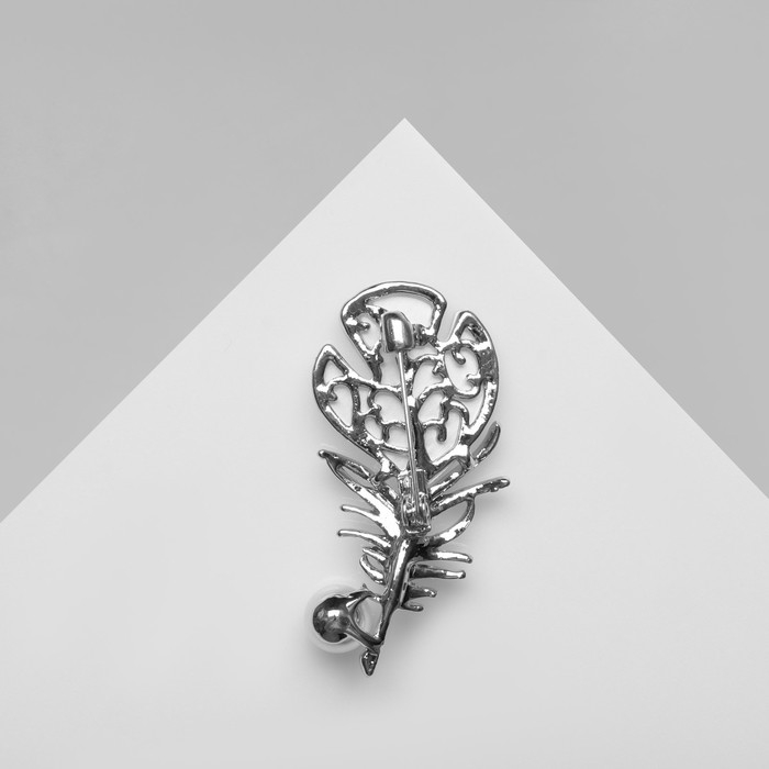 Брошь «Перо» с бусиной, цвет белый в серебре