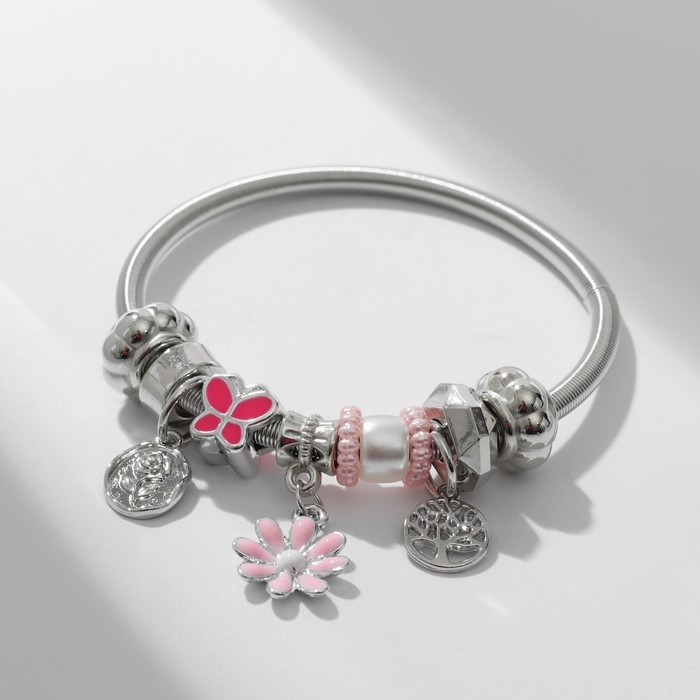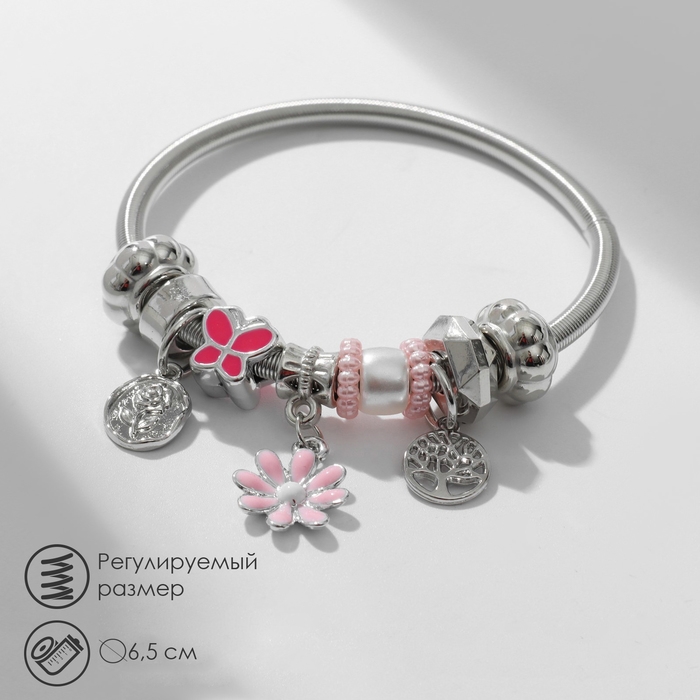 Браслет ассорти «Марджери» одинарный, цветочек, цвет розовый в серебре
