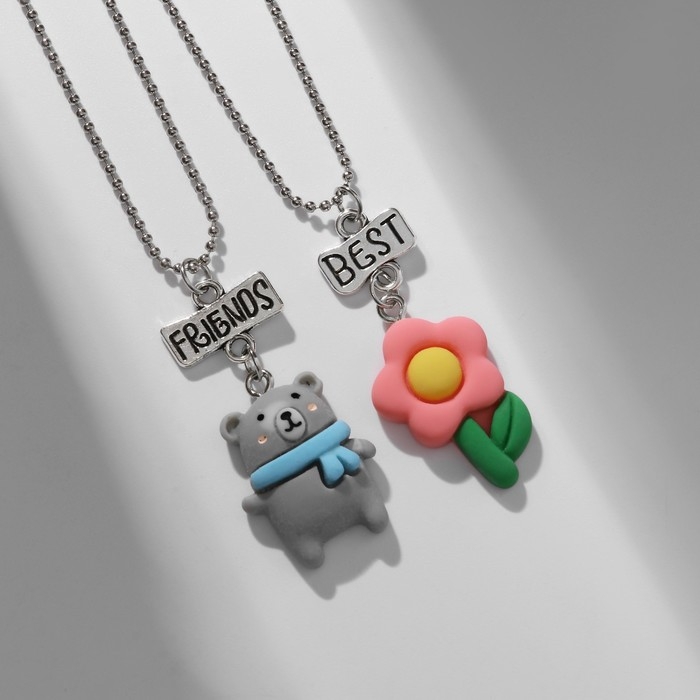 Кулоны «Неразлучники» медведь и цветок, цветные в серебре, 40 см