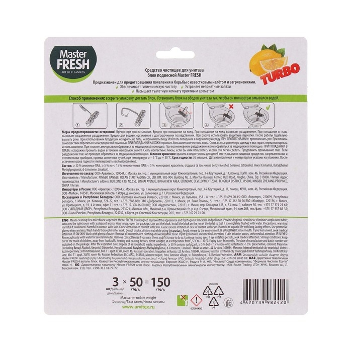 Блок для унитаза Master FRESH, ТУРБО, лимон - это незаменимый помощник в поддержании чистоты и свежести в туалетной комнате. Этот продукт представляет собой набор из трех блоков, каждый из которых содержит уникальную формулу, обеспечивающую длительное и эффективное действие.