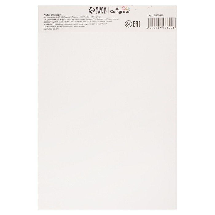 Альбом для акварели А4, 24 листа на склейке Calligrata, обложка мелованный картон, блок рисовальная бумага 180 г/м2