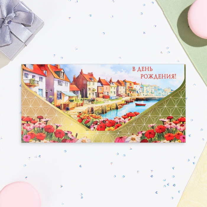 Конверт для денег "В День Рождения!" городок, софт-тач, тиснение, 19 х 9 см