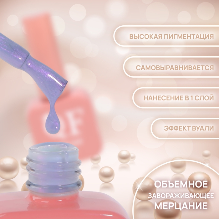Деликатное сияние гель лака раскрывается при попадании на покрытие света. Перламутровый лак равномерно распределяется и идеально сцепляется с ногтевой пластиной. Используйте для праздничного и повседневного маникюра. Индикатор цвета на верху бутылька, поможет Вам подобрать идеальный цвет.