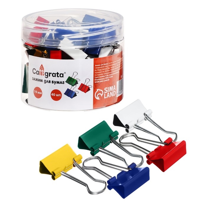 Набор зажимов для бумаг цветных 19мм, 40 штук, 4 цвета, в пластиковой тубе