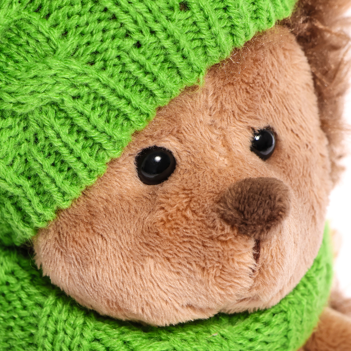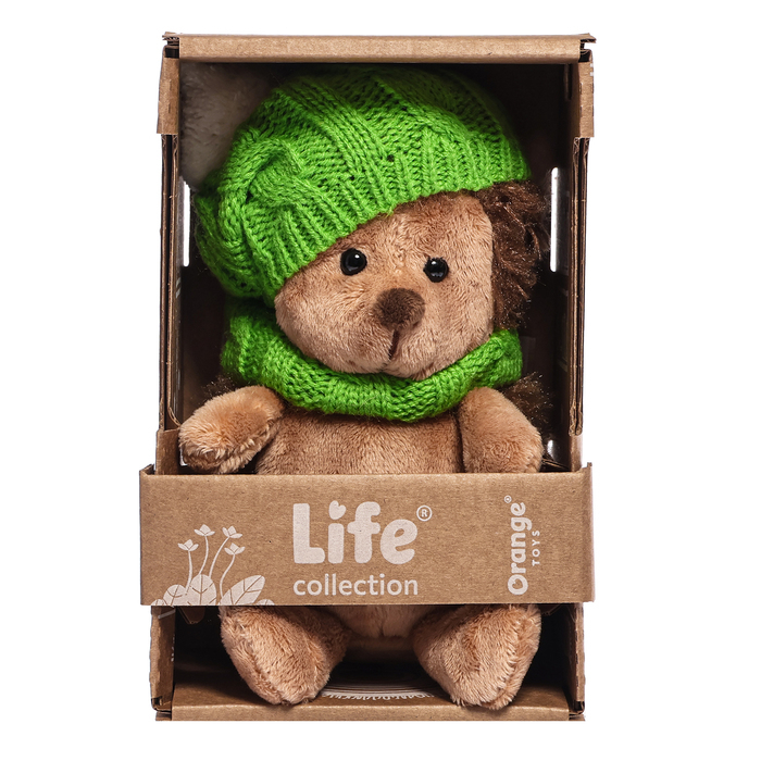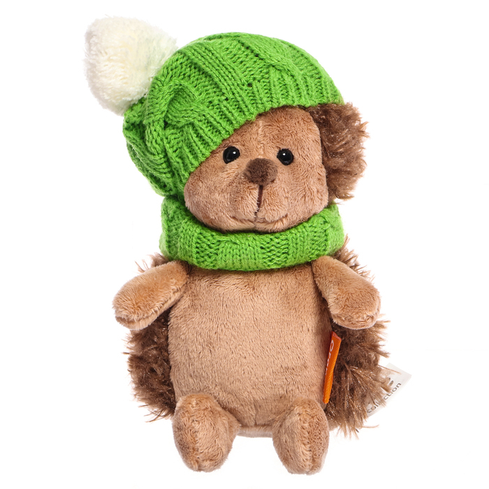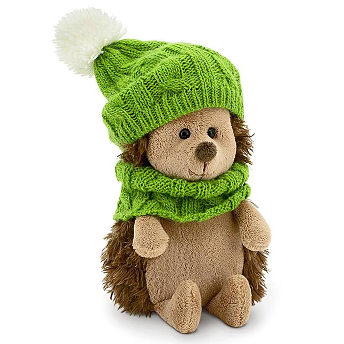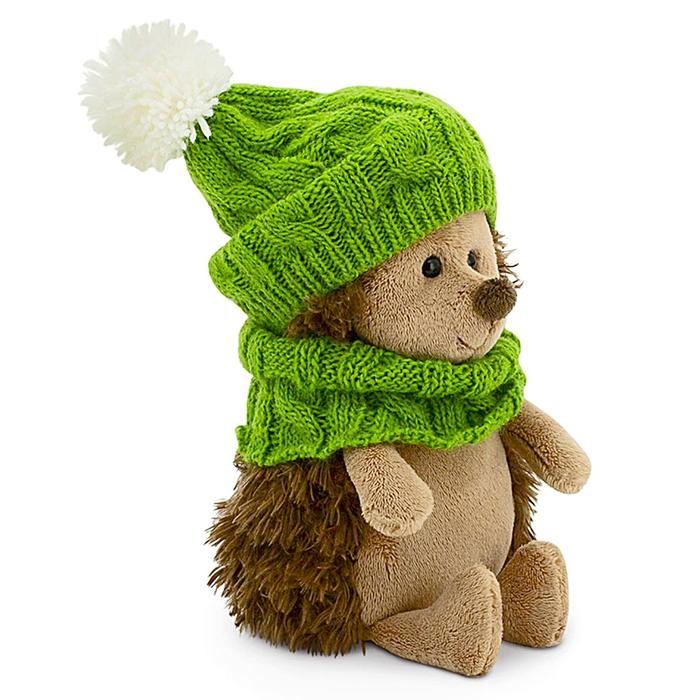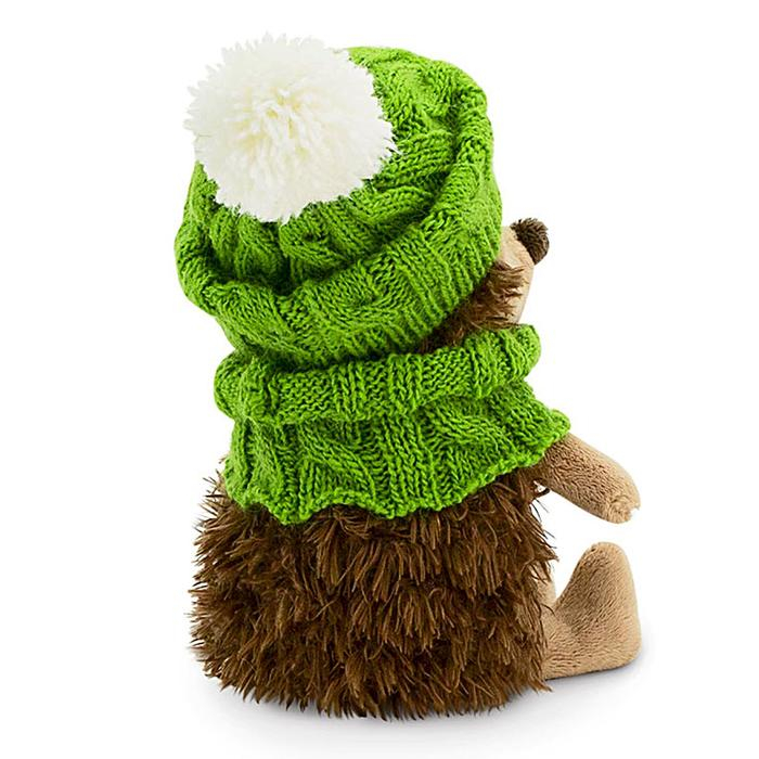 - Очаровательный ёжик не боится зимних холодов, ведь его будет согревать яркий и стильный комплект зелёного цвета, состоящий из шапки с белым помпоном и манишки.