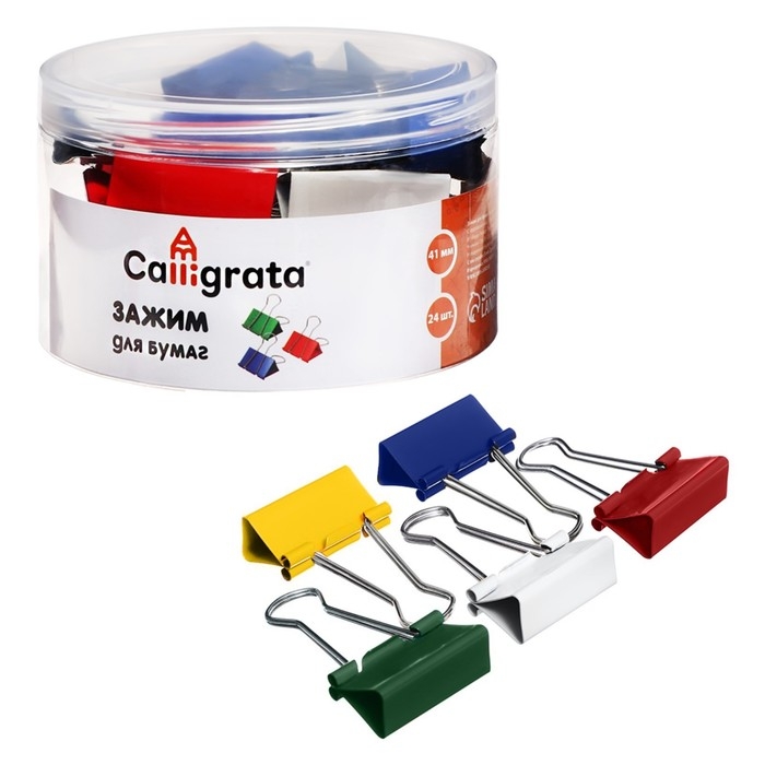 Набор зажимов для бумаг цветных 41мм, 24 штук, 5 цветов, в пластиковой тубе
