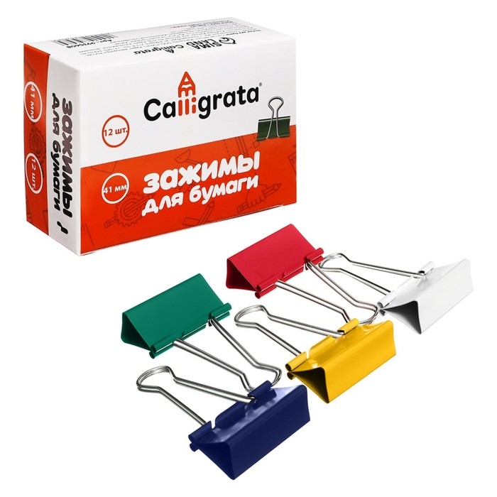 Набор зажимов для бумаг цветных 41мм, 12 штук, 5 цветов, в картонной коробке